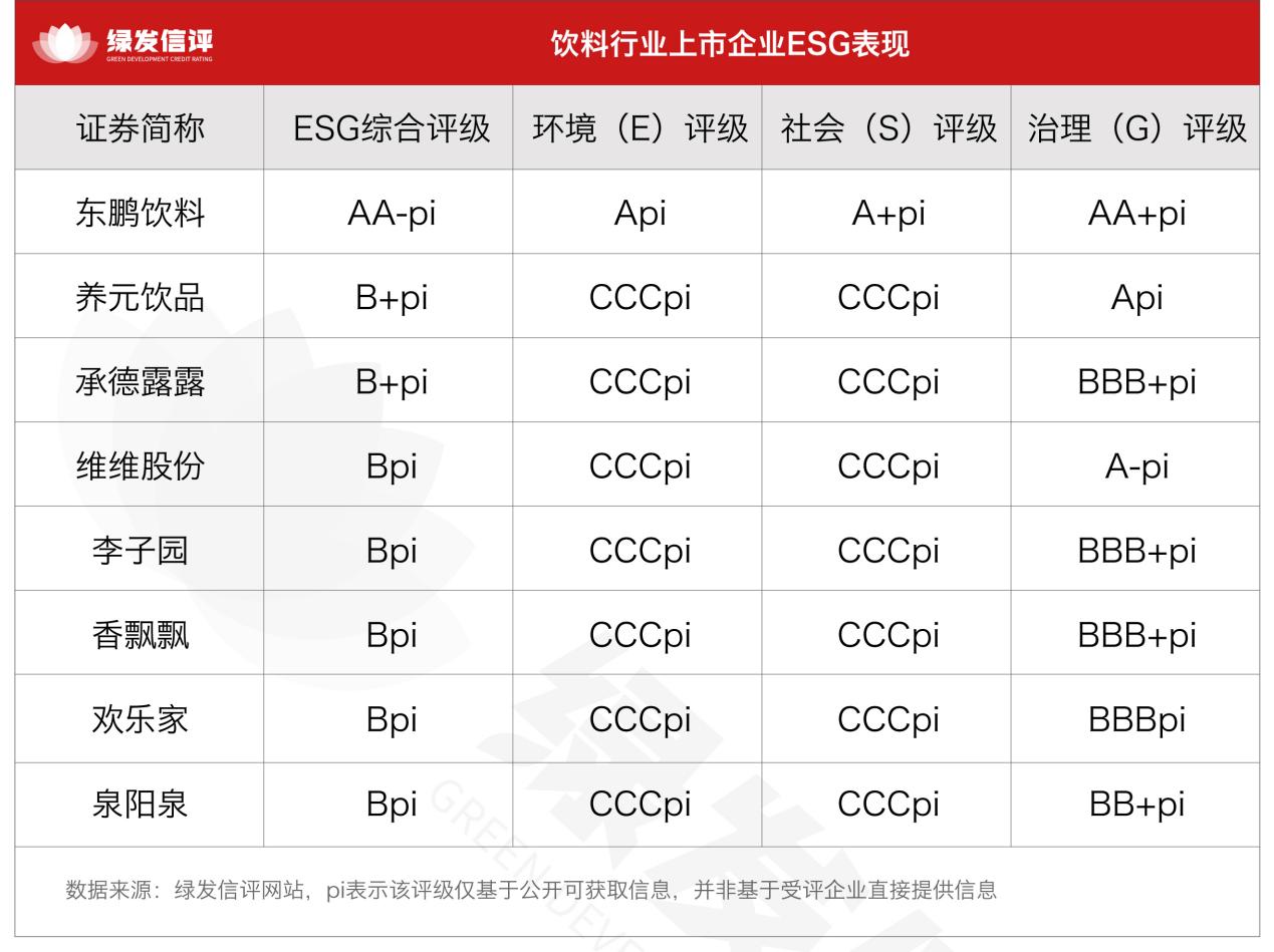 绿发信评主动评级效力露馅,饮料行业ESG详细阐扬呈现显著的南北极分化时势,东鹏饮料以AA-pi评级成为行业第一梯队;养元饮品和承德露露的详细评级为B+pi;维维股份、李子园、香飘飘、精炼家和泉阳泉的详细评级均为Bpi。评级的各异性主要体当今上市公司ESG数据表示的完满性,行业大宗企业可合手续发展信息表示缺失,拉低了评级效力。