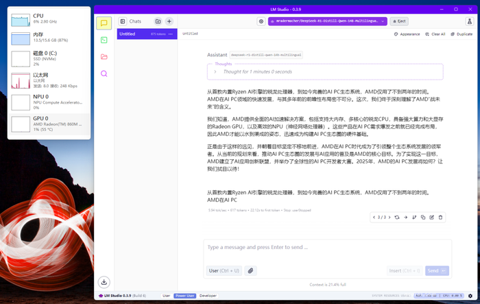 AI诓骗越来越普及,ThinkPad T14 Gen6锐龙版算作AI札记本,具备50 TOPs的NPU算力,虽然也提供了高效的AI加快能力。锐龙AI 7 PRO 350在土产货AI诓骗中,可以禁受使用CPU、NPU或者GPU进行加快。举例在LM Studio中,咱们用锐龙AI 7 PRO 350内置的Radeon 860M GPU加载DeepSeek 14B蒸馏模子来生成翰墨内容,处理速率梗概为7.14 Tokens/s,用CPU来揣摸,处理速率梗概为5.94 Tokens/s。关于一些端侧轻载AIGC诓骗(举例生成翰墨内容、处理文档、生成新媒体配图等等)来讲,这个速率全皆可以得志需求。终点值得一提的是,ThinkPad T14 Gen6锐龙版依托AMD独到的UMA(调和内存架构)期间,支抓最高分袂16GB内存算作集显的专用显存,因此在支抓AI模子的能力上与领有16GB显存的独显特别,是以也称得上是性价比很高的土产货AI解决决策。虽然,要是使用锐龙AI 7 PRO 350的CPU进行AI加快,那么配备32GB内存的ThinkPad T14 Gen6锐龙版还可以加载更大的AI模子,可以说在这方面它对AI模子的顺应能力亦然可以的。