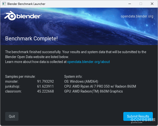 ▲锐龙AI 7 PRO 350在Blender Benchmark中的推崇也达到了高端8核处理器的水准