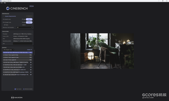 ▲锐龙AI 7 PRO 350的Cinebench 2024多线程得分达到711