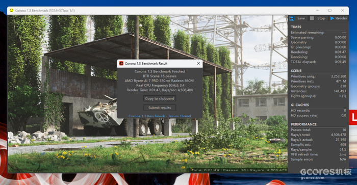 ▲锐龙AI 7 PRO 350在Corona 1.3 Benchmark中的收获为1分47秒